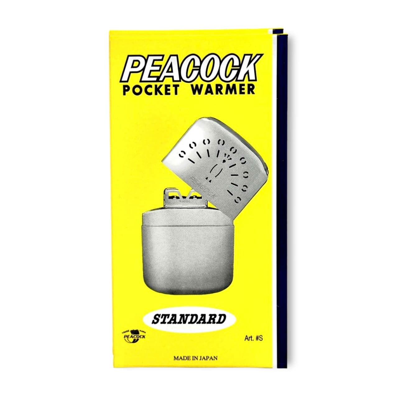 The box contains a Hakkin PEACOCK pocket warmer STANDARD, measuring cup, dedicated fleece cover, and instruction manual.