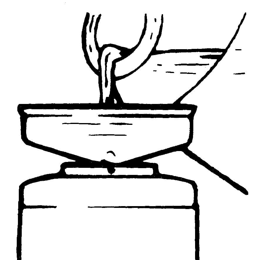 Insert the bottom of the oil cup into the tank. Align the oil cup parallel to the main body of the warmer and pour benzine into the cup up to the line marked on the cup.